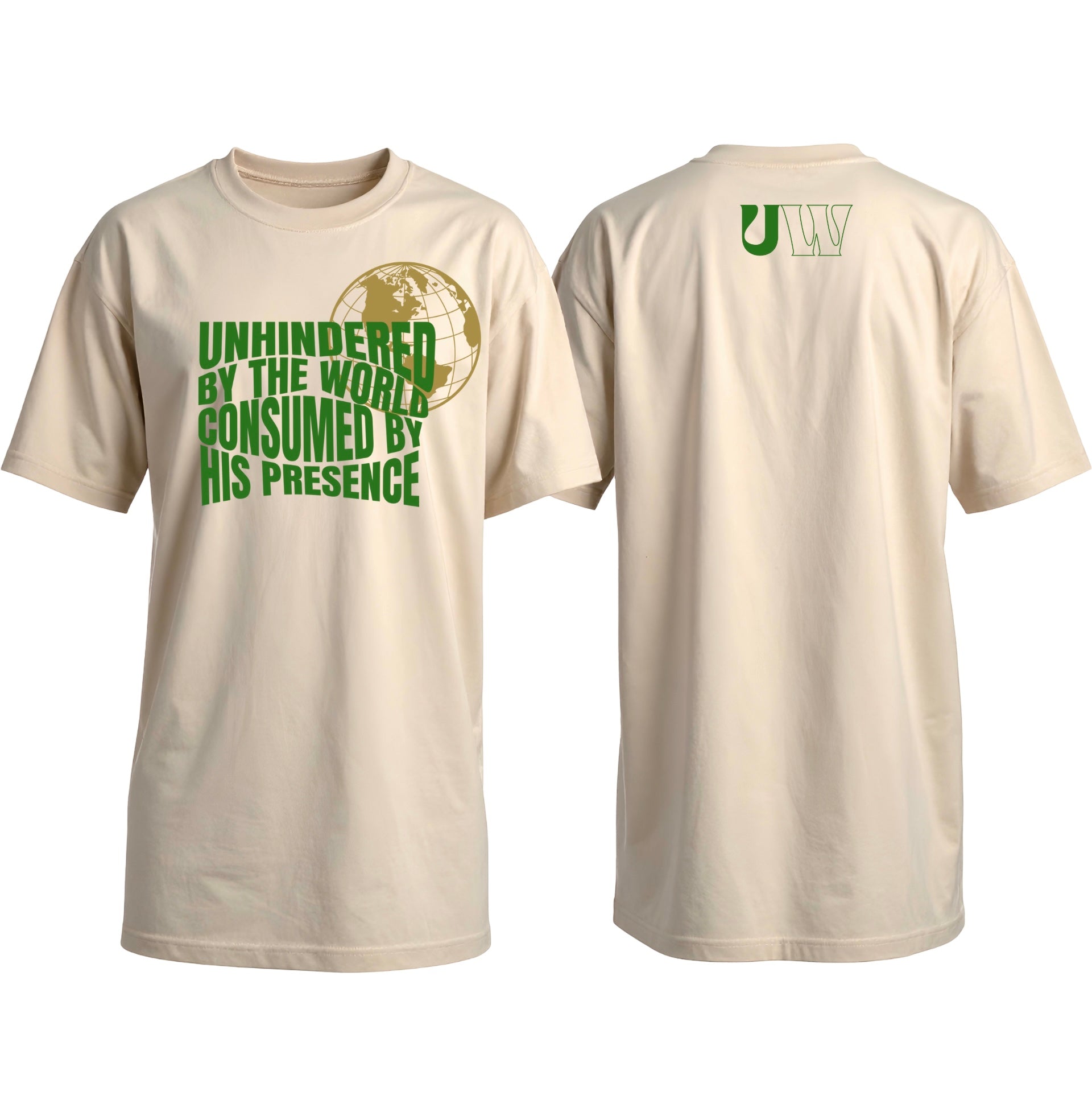 . This unique piece of apparel features powerful text and a graphic of the globe, perfect for expressing a commitment to spiritual devotion over worldly concerns.- Design & Message: The t-shirt displays the text "UNHINDERED BY THE WORLD CONSUMED BY HIS PRESENCE" in bold green lettering, paired with a subtle gold-colored globe graphic, symbolizing a focus beyond the material world.